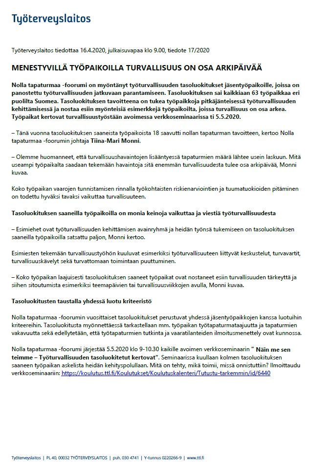 Meramatecille Tasoluokka I TyöturvallisuusluokituksessaKirjoittaja mer@ma-Tec / 16 huhtikuun, 2020 Meramatec Oy sai jälleen tunnustusta työstään työturvallisuuden edelläkävijänä. Nolla tapaturmaa- foorumi myönsi Meramatecille parhaimman tasoluokituksen työturvallisuuden jatkuvan parantamisen ja kehitystyön johdosta. Lue Lisää